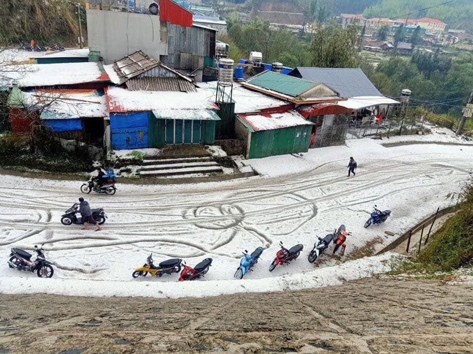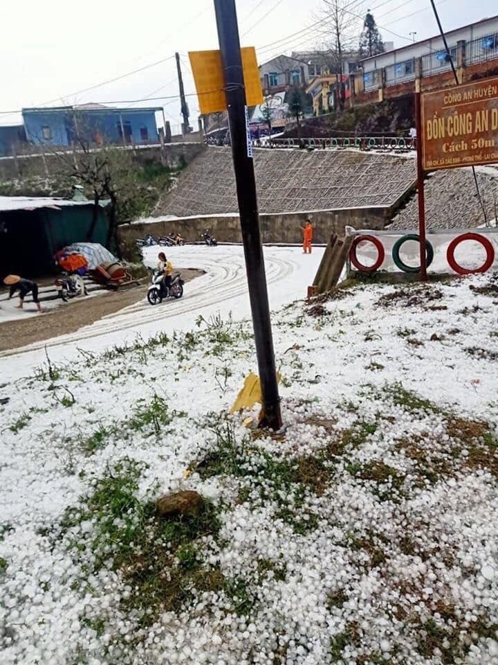 Mưa đá rơi ngập đường trắng xóa, phủ kín sân trường học, nhà dân, gây thiệt hại về tài sản và hoa màu.