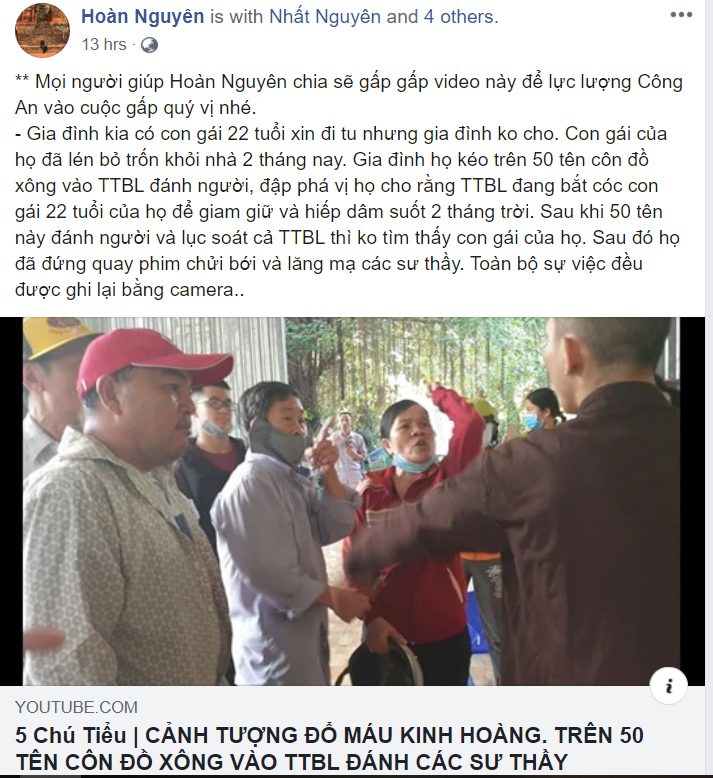 Bài đăng trên trang mạng xã hội kêu gọi chia sẻ vụ việc nhóm 50 người xông vào tịnh thất Bồng Lai đập phá, đánh một sư thầy bị thương khiến cộng đồng mạng xôn xao