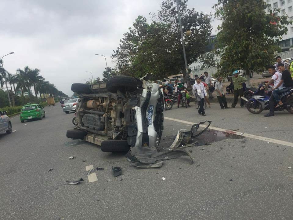 Xe biển xanh nát phần đầu, lật ngang giữa đường sau cú tông trực diện với xe ô tô 4 chỗ.