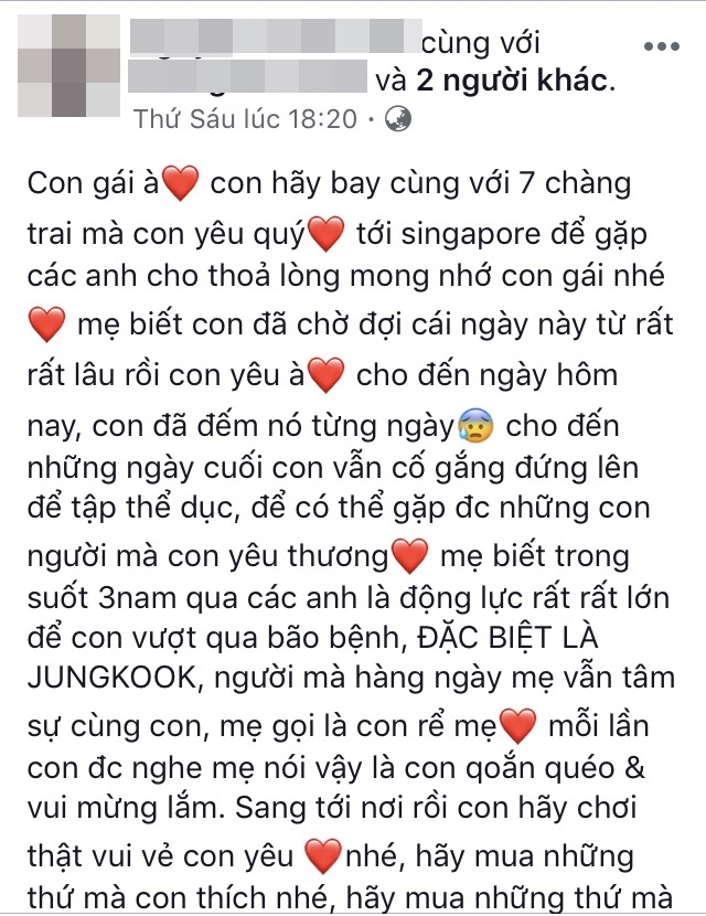 “Con gái à. Con hãy bay cùng với 7 chàng trai mà con yêu quý. Tới Singapore để gặp các anh cho thỏa lòng mong nhớ con gái nhé. Mẹ biết con đã chờ đợi cái ngày này từ rất rất lâu rồi con yêu à. Cho đến hôm nay con đã đếm nó từng ngày. Cho đến những ngày cuối con vẫn cố gắng đứng lên tập thể dục, để có thể gặp được những con người mà con yêu thương. Mẹ biết trong 3 năm qua, các anh là động lực rất lớn để con vượt qua bạo bệnh.