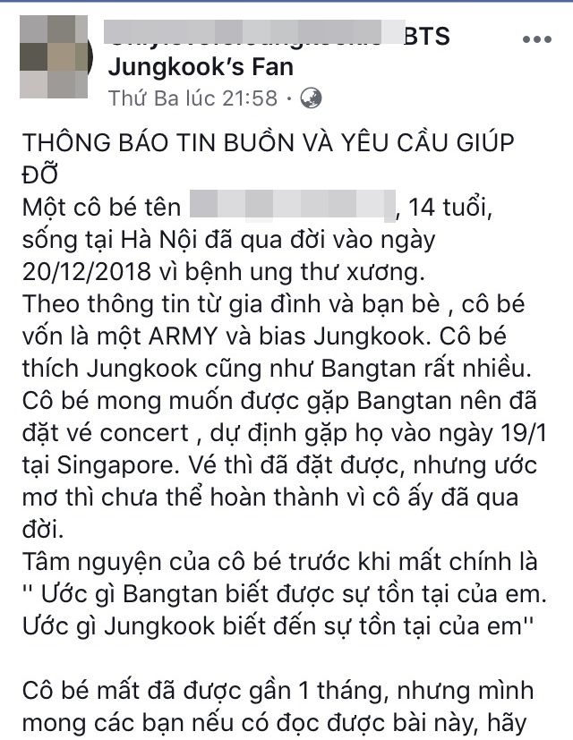 Bức tâm thư mà người mẹ cùng những chia sẻ của một số fan trong cộng đồng V-Army (Fan BTS tại Việt Nam) dành cho cô bé K.L, 15 tuổi đã ra đi vì căn bệnh ung thư xương khiến nhiều người đau lòng.