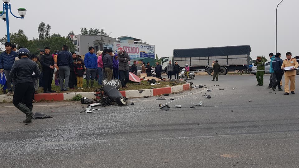 Đúng lúc này, một xe tải mang BKS Bắc Ninh chạy hướng từ xã Tiền Phong lên trung tâm huyện Mê Linh không làm chủ được tốc độ đã đâm trực diện vào cả người lẫn xe rồi tiếp tục phi sang bên kia đường. Chiếc xe tải chỉ chịu dừng lại khi đâm xuống ruộng bên đường.
