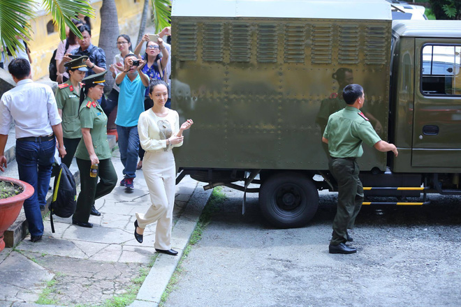 Xuất hiện tại phiên toà, hoa hậu Phương Nga vẫn mặc bộ đồ trong phiên xét xử lần trước. Trước và trong phiên xét xử, cô mỉm cười mỗi khi nhìn người thân.